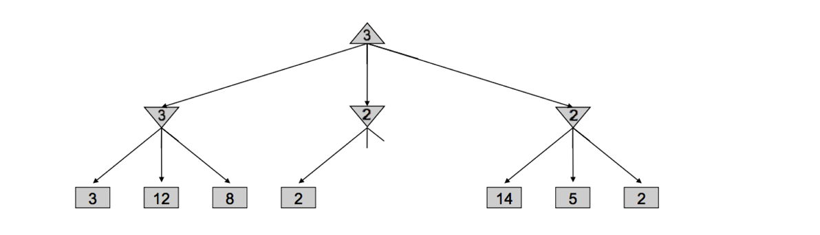 如图, 当探索完左侧节点3之后, MAX根节点已经至少得到了3, 而中间的MIN节点此时最好情况也是2, 因此MAX根本不需要考虑这个节点的其余子节点