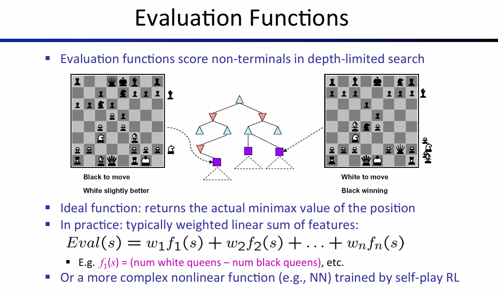 评估函数是一个启发式函数,它接收一个非终端的游戏状态(例如,一个中盘的棋局)作为输入,并输出一个数值,这个数值估计了该状态对 MAX 玩家的最终效用值。