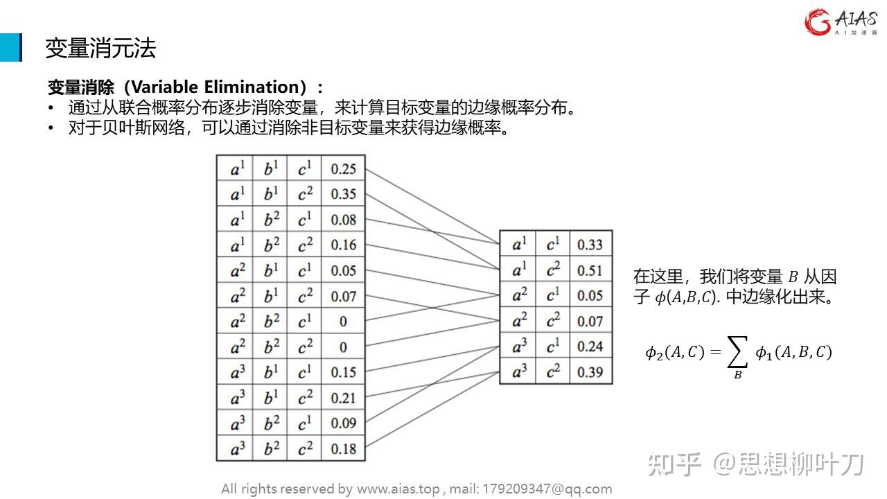 求和消除:对这个新的临时因子,关于待消除的变量进行求和(或积分)。这个操作的结果是一个不包含该变量的新因子。