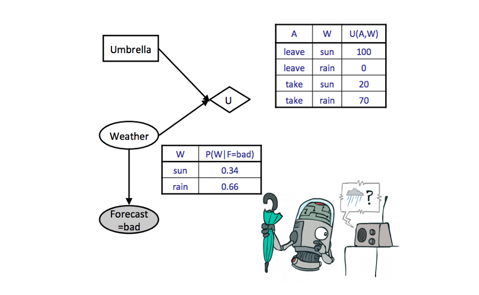 这个计算告诉我们,在预报为坏的情况下,如果不带伞,我们平均可以期望获得 34 个单位的效用。这个值综合了 34% 的概率获得 100 效用和 66% 的概率获得 0 效用的情况。