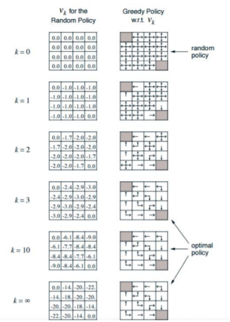 - 迭代次数越多,价值函数就考虑得越”长远”。一个格子的价值反映了从它出发,在随机策略下平均需要走多少步才能到达终点。例如,在 k=∞ 时,中心的四个格子价值收敛为-20,表示从那里出发平均需要”走”20步才能结束。而紧邻终点的格子价值为-14,因为它们离”出口”更近。